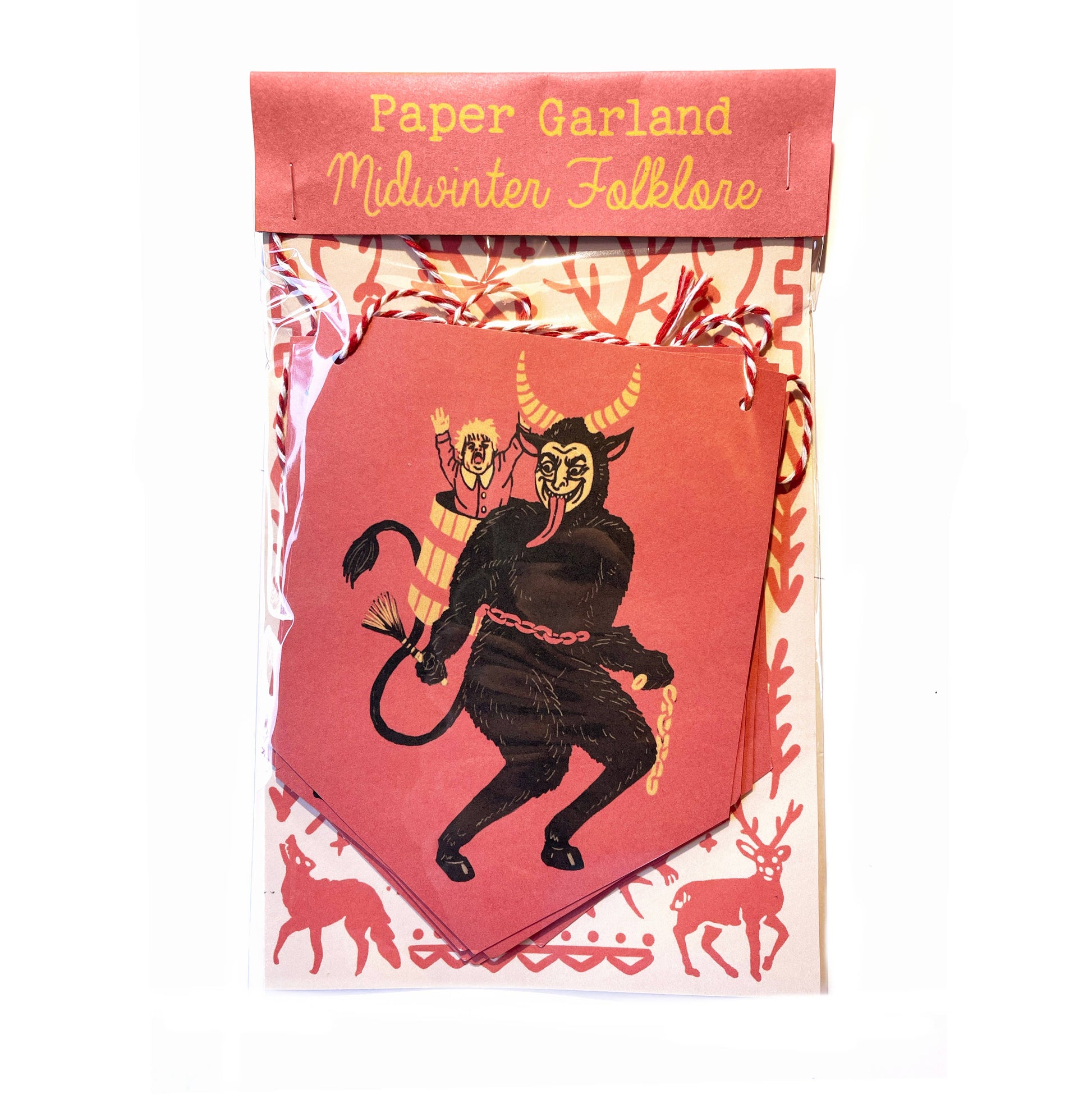 When the nights are long and snow covers the land, we find the folk tales of midwinter. This paper garland is approximately 6 ft long and features eight illustrated folk tales from around the world, from Krampus, Belsnickle and Jólakötturinn, to Mari Lwyd and the Wild Hunt. It is recommended for indoor use only.
